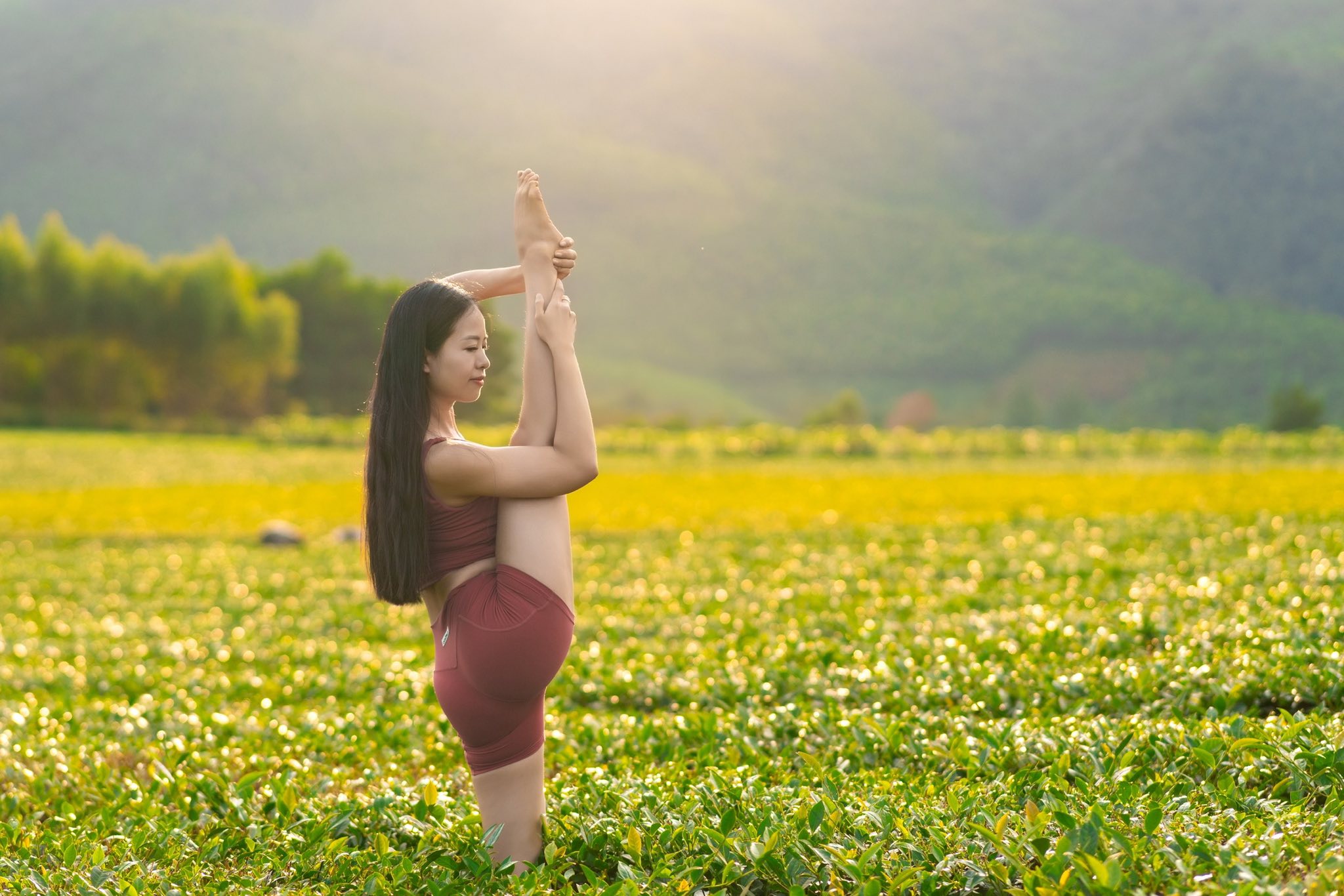 Giữa đồi chè xanh ngắt, mùa thu nhẹ rơi trên đôi vai cô gái yoga 🥰