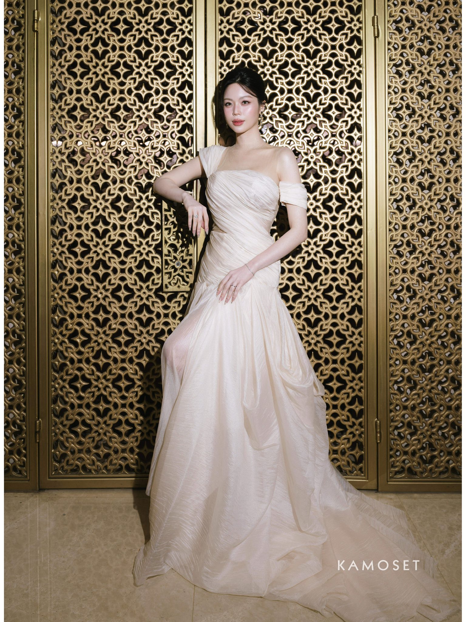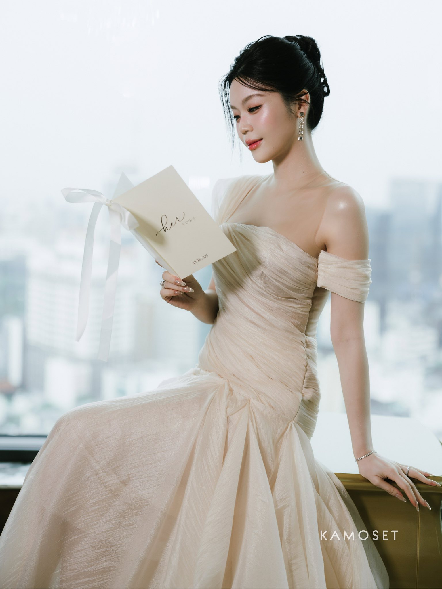 Thiết kế đặc biệt dành riêng cho cô dâu trong buổi Get Ready cho ngày đặc biệt. Dáng váy lệch vai tinh giản, tôn bờ vai thon và đường cong mềm mại, chất liệu silk tơ xoắn nhẹ như làn gió lướt qua thềm ngực độc đáo.