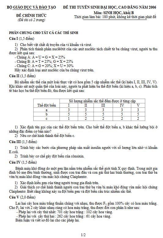 Đề thi đại học, cao đẳng môn Sinh năm… 2006 – Năm cuối cùng thi tự luận để các em xem nhé.