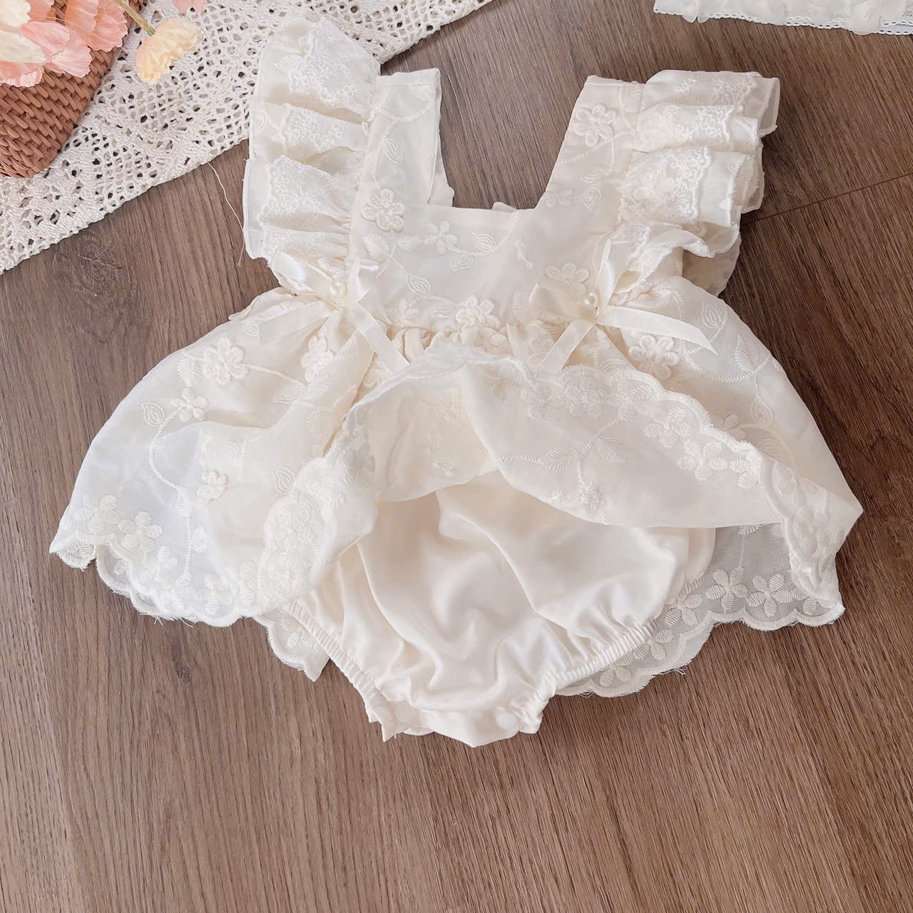Nói thật là phải đam mê lắm bên e mới sản xuất mẫu này ấy ạ. Bởi vì riêng 2 cái nơ xinh xinh đính ngọc trai kia là bên em làm thủ công đó. Ngồi thắt nơ rồi đính ngọc còng lưng. Được cái cả xưởng ngồi làm mà nói cười rúc rích cũng đỡ nhọc, keke.