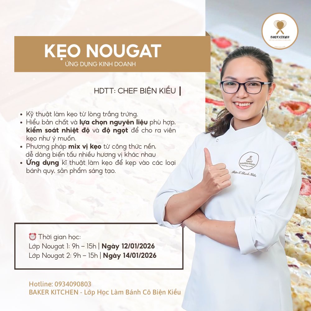 🎀 Lớp chuyên đề dành cho những ai muốn nắm vững kỹ thuật làm kẹo #Nougat từ nền tảng đến ứng dụng thực tế. Học viên được tiếp cận các kiến thức cốt lõi có thể áp dụng cho nhiều loại bánh kẹo khác nhau, đặc biệt phù hợp để phát triển sản phẩm kinh doanh vào các dịp lễ, Tết, Valentine,…
