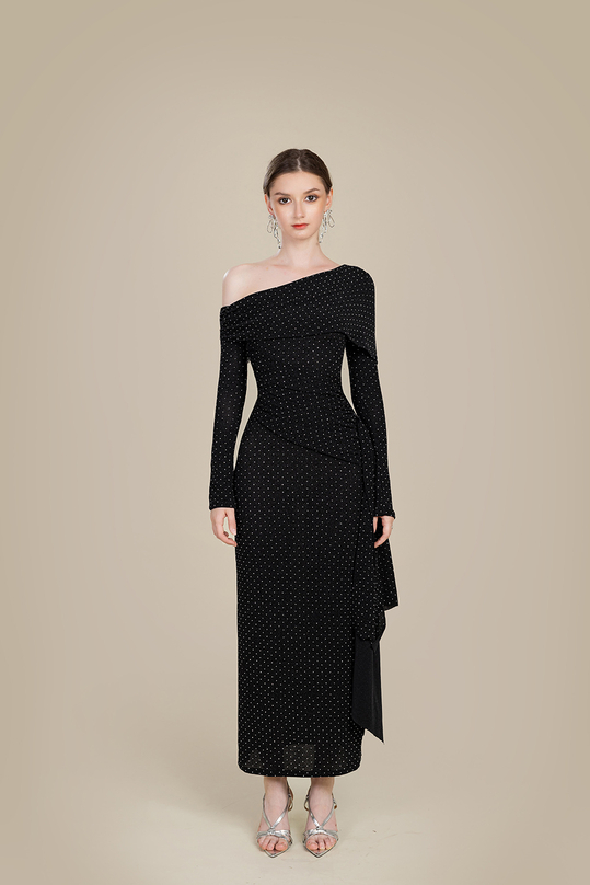Mẫu váy đặc biệt của bộ sưu tập “Body Same Me” chính là thiết kế váy dự tiệc cao cấp HL28-14. Mẫu váy dự tiệc ôm dài giúp phái nữ tự tin hơn vào 3 vòng của mình khi tôn đúng chuẩn chỉnh 3 vòng nhờ vào chất liệu thun 4D đính đá có độ đàn hồi tốt. Gam màu đen, kết hợp những viên đá lấp lánh tăng thêm phần sang trọng và quyến rũ cho mọi quý cô. Phần vai áo lệch, kết hợp tay áo dài cũng là điểm cộng cho chị em chưa tự tin về bắp tay, cũng như bờ vai của mình, nhờ vào đường chéo tạo cảm giác thon gọn hơn bao giờ hết. Thân hình đồng hồ cát xuất hiện ở những buổi tiệc cùng với sự khác biệt khi quý cô kết hợp thêm chút phụ kiện như giày gót nhọn, đôi bông tai lấp lánh và kiểu tóc búi sang trọng.
